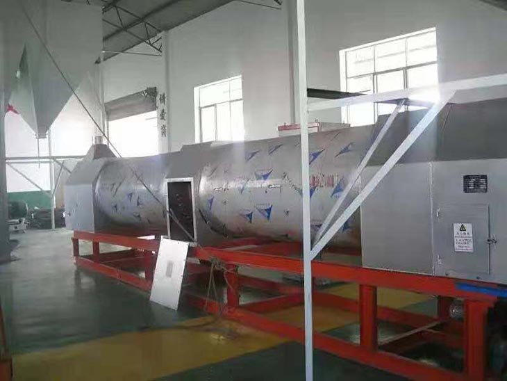 我們解決其技術(shù)問題所采用的技術(shù)方案是:一種新型環(huán)保節(jié)能熱風(fēng)炒爐,由電源供電,包括第一燃燒室、第二燃燒室、熱風(fēng)炒爐滾筒、存料機(jī)、自動喂料器、出料機(jī)、引風(fēng)機(jī)和排潮風(fēng)機(jī),所述熱風(fēng)炒爐滾筒的入口端通過自動喂料器與所述存料斗連通,所述熱風(fēng)炒爐滾筒的入口端還通過風(fēng)道與所述排潮風(fēng)機(jī)連通,所述熱風(fēng)炒爐滾筒的出口端與出料機(jī)連通,所述第一燃燒室和第二燃燒室通過風(fēng)道與引風(fēng)機(jī)連通,所述第一燃燒室和第二燃燒室分別位于所述熱風(fēng)炒爐滾筒的下方,所述熱風(fēng)炒爐滾筒軸心線與水平面形成2°到8°的夾角,所述第一燃燒器和第二燃燒器安裝位置在相應(yīng)燃燒室的前端或者相應(yīng)燃燒室的兩個側(cè)面。我們設(shè)備取消了原熱風(fēng)炒爐所配套的單獨(dú)熱風(fēng)爐、彎段風(fēng)道或直段風(fēng)道;在炒爐滾筒下方設(shè)計安裝兩份熱風(fēng)燃燒室,用燃燒器產(chǎn)生的熱風(fēng)直接對滾筒進(jìn)行加熱,******限度地縮減了炒爐散熱環(huán)節(jié)和面積,從而實(shí)現(xiàn)炒爐連段式加熱。與現(xiàn)有設(shè)備相比,我們公司設(shè)備充分利用了熱風(fēng)釋放的熱量,減少了熱量損失,單噸油料或糧食加工消耗添人氣甚至能降低到25nm3,降低了17%,節(jié)能降耗效果非常明顯,得到了客戶的一致好評。與現(xiàn)有設(shè)備相比,同等日加工量,所配兩臺燃燒器合計功率比現(xiàn)有設(shè)備燃燒器功率下降20%-30%,熱風(fēng)設(shè)定溫度有750-800℃下降到400-500℃,明顯延長了炒爐的使用壽命。第一燃燒室和第二燃燒室的功能各不相同,工作溫度也不一致,第一燃燒室和第二燃燒室能夠?qū)崿F(xiàn)分段加熱溫度控制,更加靈活與合理,安全可靠,便于操作與控制。